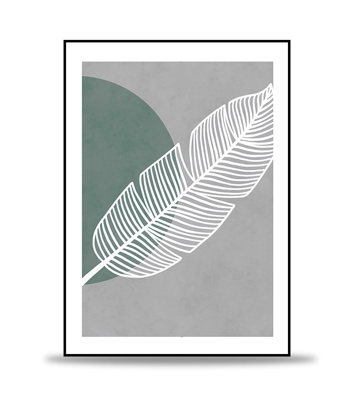 Dieses Plakat zeigt ein modernes grafisches Design mit einer stilisierten weißen Feder vor einem doppelten Hintergrund aus kreisförmigen und grünen Tönen, die ein Gefühl von Ruhe und Raffinesse vermitteln.