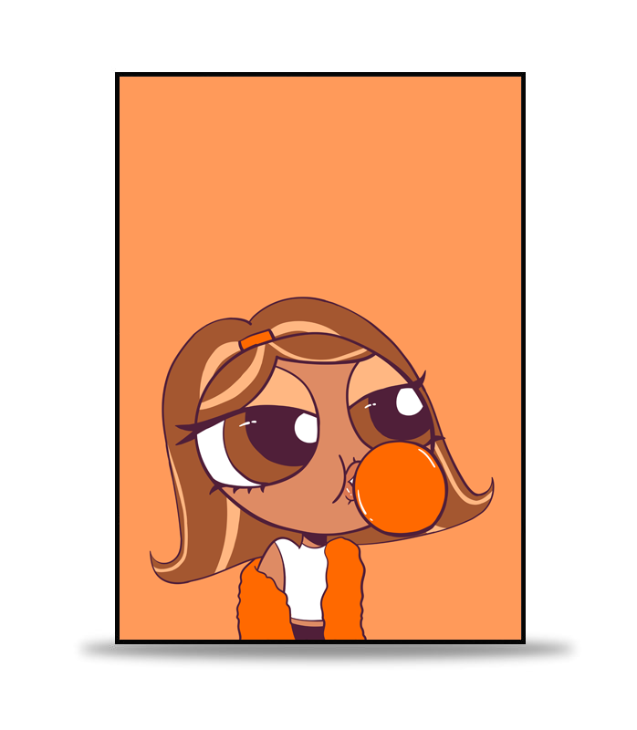 Grafische Illustration, inspiriert von der Serie "The Powerpuff Girls", eines Mädchens, das mit seinem Kaugummi Blasen macht, mit markanten orangefarbenen Details. Ein Poster, das ein Gefühl der Retrospektive vermittelt und gleichzeitig einen Sinn für Mode zeigt.