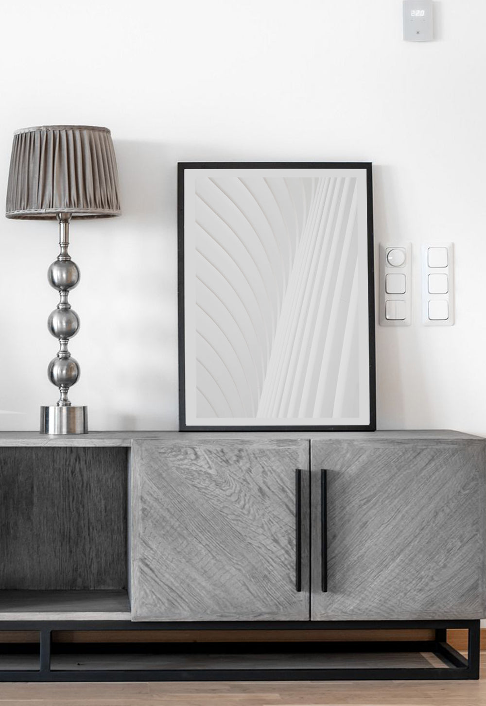 Das Bild zeigt ein minimalistisches Plakat mit weißen, weichen und wellenförmigen Formen, die eine dynamische und rhythmische Struktur schaffen und ein Gefühl von Ruhe und Reinheit vermitteln.