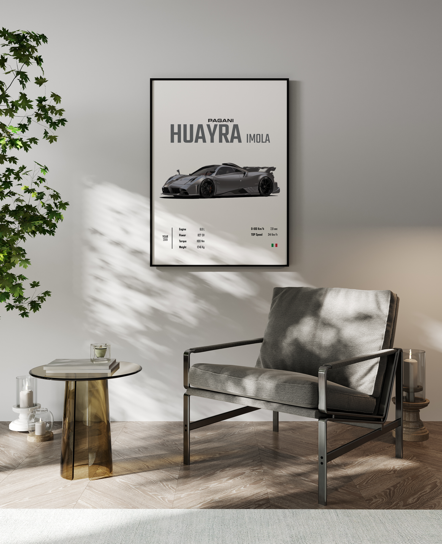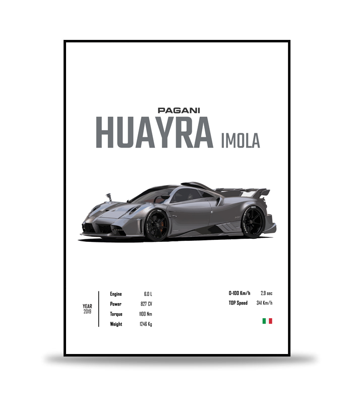 Poster des Automodells Huayra Imola von Pagani auf weißem Hintergrund mit detaillierten Informationen über das Auto am unteren Rand.