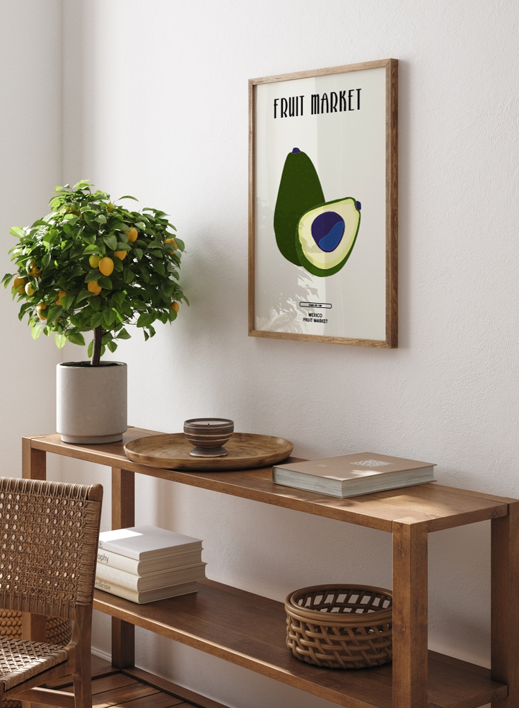 Plakat mit Abbildung einer ganzen und einer halben Avocado auf beigem Hintergrund mit Textmotiv oben und unten.
