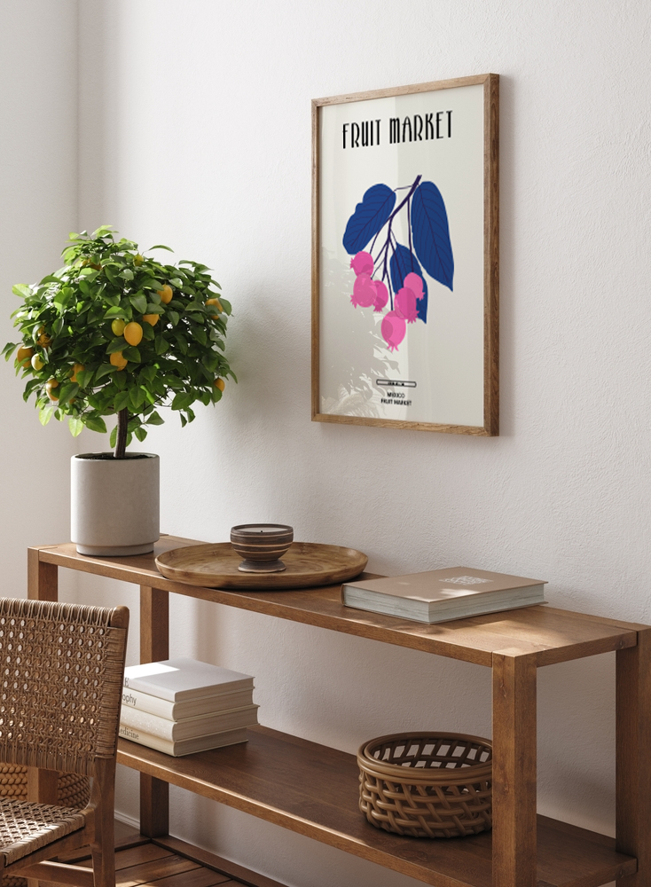 Poster mit Illustration einer rosa Beere mit blauen Blättern auf beigem Hintergrund mit Textmotiv oben und unten.