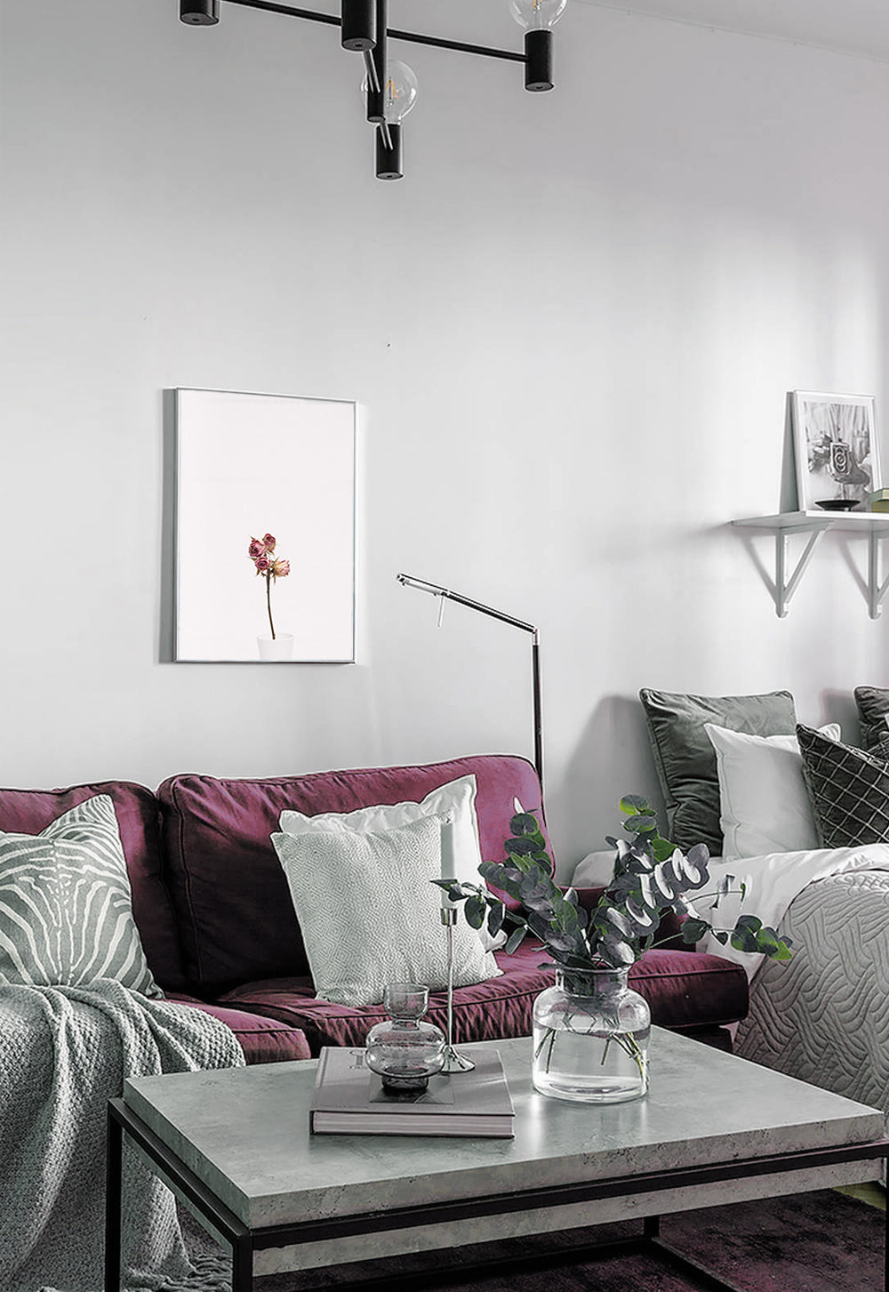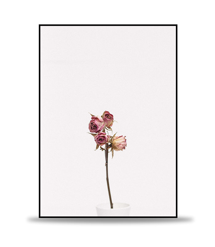 Ein einfaches und elegantes Plakat, das einige fast verwelkte Rosen in einer kleinen Vase vor einem sauberen weißen Hintergrund zeigt und die Schönheit und Vergänglichkeit der Blumen betont.