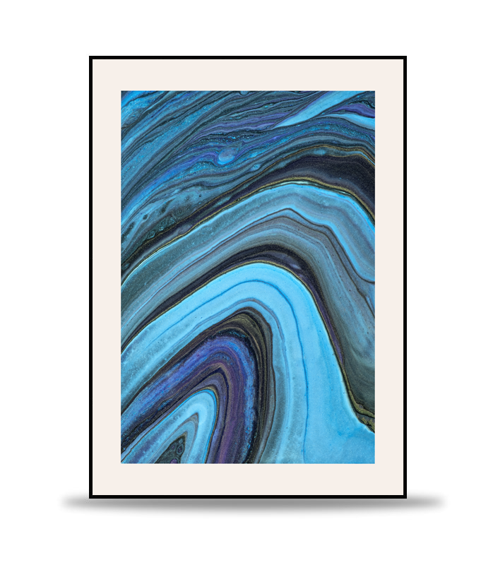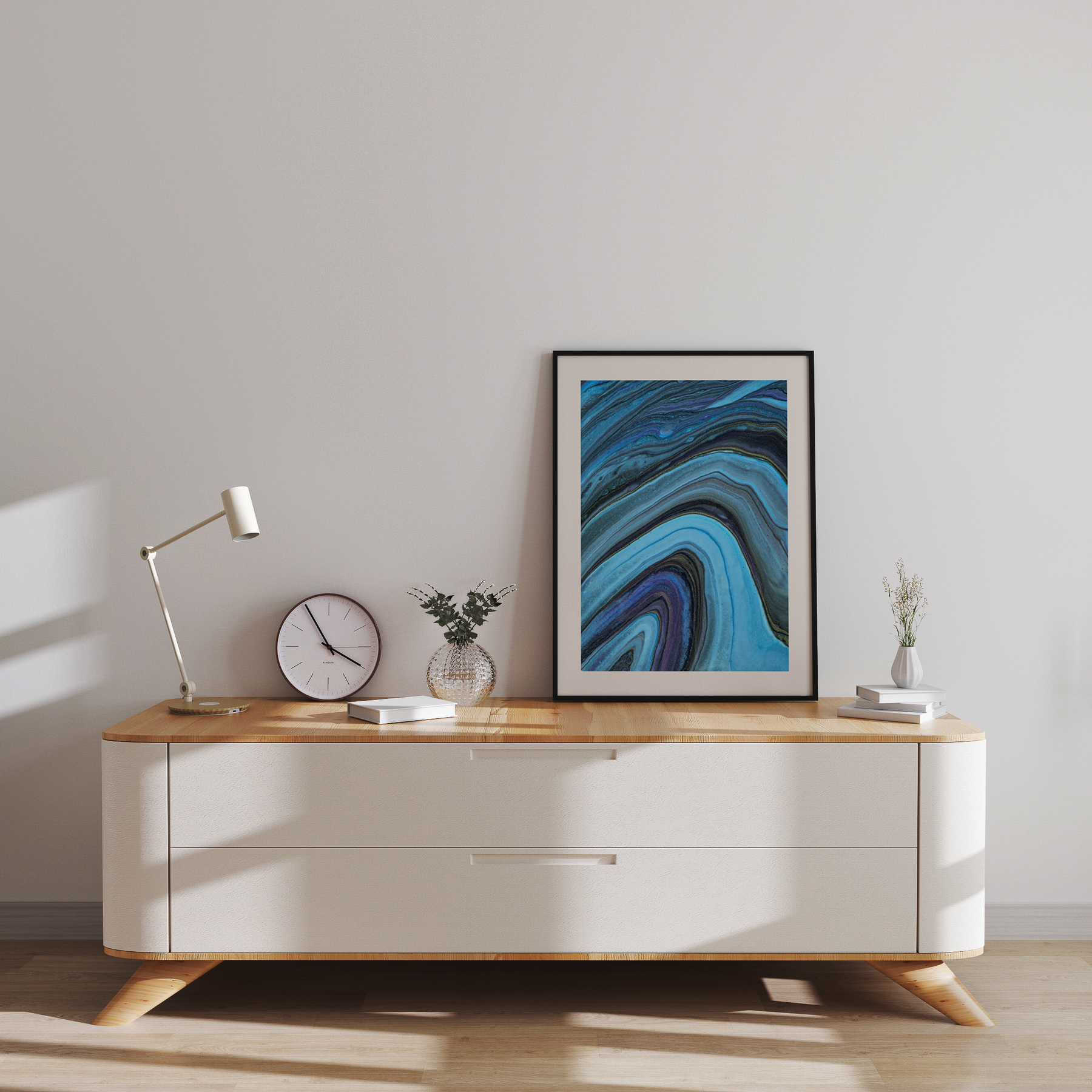 Plakat mit abstrakter Handmalerei, die eine Nahaufnahme von Blautönen auf beigem Hintergrund illustriert. Ein Poster, das ein zeitloses und künstlerisches Gefühl vermittelt.
