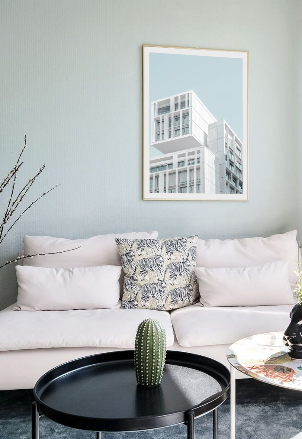 Dieses Plakat zeigt ein modernes Gebäude mit einer sauberen und klaren Architektur, vor einem klaren Himmel, der ein Gefühl von Ordnung und zeitgenössischem Design vermittelt.