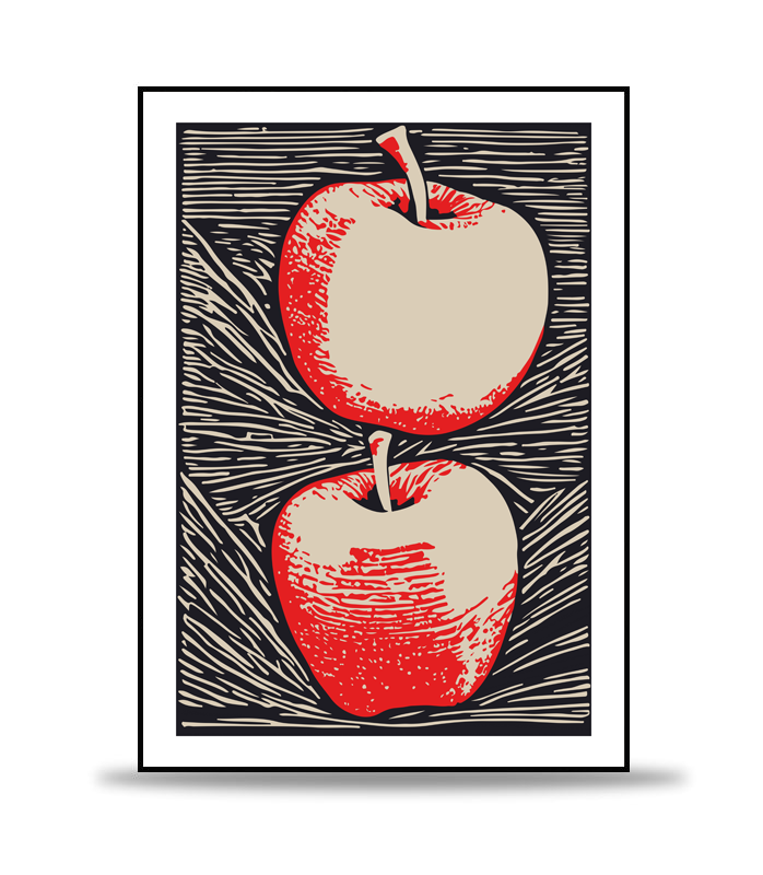 Detaillierte Illustration von zwei Äpfeln in roten und beigen Farben auf einem schwarzen Hintergrund mit beigen Linien und weißen Rändern.